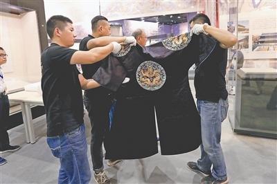 天津美术网讯 即将于9月16日在成都博物馆正式拉开大幕的重磅展“盛世天子—清高宗乾隆皇帝特展”的文物开箱工作正式进行。数位来自故宫的专家,布展人员,协同押运、安保、武警守卫等工作人员一起开展此项重要工作。多个备受关注的重磅文物昨日终于在成都一展庐山真面目,大概30余件文物开箱进入展柜。整个工作过程十分细致,双方交接、清点、开箱、搬动,都小心翼翼,心细如发。面对一堆包装严实、规矩整齐的文物箱,一时还有些恍惚:这里面可是装着300年的时光呢。图为石青色云龙衮服被开箱取出。 (来自:成都商报)