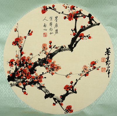 梅,在暗雪下悄然来到人间,白雪皑皑之中也能看见她的身影,将雪掩映地如小姑娘的脸一样,红得有些害羞。小小的花朵,密密的蕾,散发着一股奇香。似乎是冬日里的西施,为冬天增添了无穷的春色。董寿平擅梅花,董氏梅花,早年师承元代王冕,中年以后则以写生入手。他曾非常仔细地观察梅花的生长过程,然后加以表现。无论墨梅粉梅,也无论疏密浓淡,各个阶段都有独到面目,人称“董梅”。董氏自上世纪50年代起开始画粉梅,其粉梅用褐色宣纸作画,或用洒金纸创作,并自调多种颜料,工作繁多,所以董寿平的粉梅基本没有尺幅较大的作品。