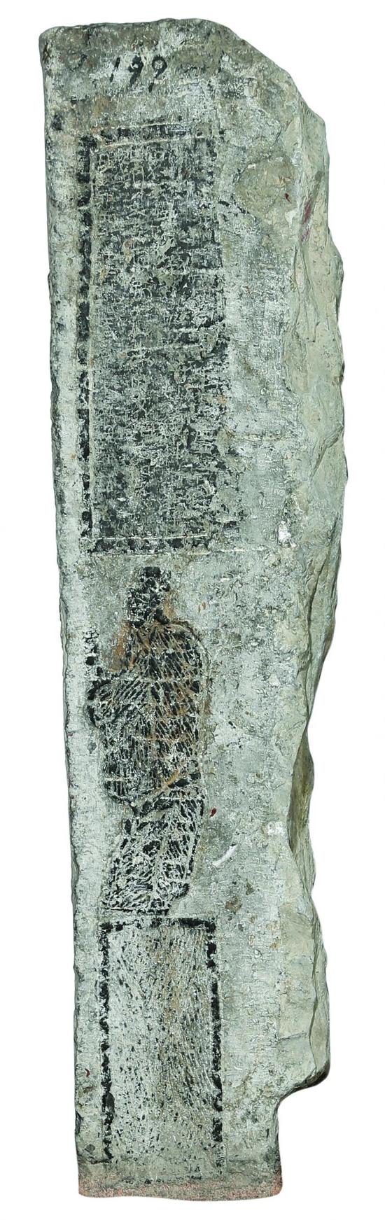 图1永元十年执笏图画像石1。永元十年执笏图画像石(图1):原石为长方体立柱,石纵93、横24、厚12厘米。属东汉中期,出土于山亭区堌城,属国家一级文物。正面图像分三层,上层为长方形边框,边框内刻有题记四行,可识别的60余字,中层一执笏人物;下层为一长方形边框,边框内饰以菱形纹;右侧面为一长方形边框,边框内饰以菱形纹。图像雕刻技法为剔地平面线刻。题记释文“以十一年十月十五日□,此□□如礼,后子孙无以□日祠,使石工书颜文羽昆弟六人,弟仲文,伯先仲京少文,母以永元十一年七月廿七日□□不幸,母年八十七”。