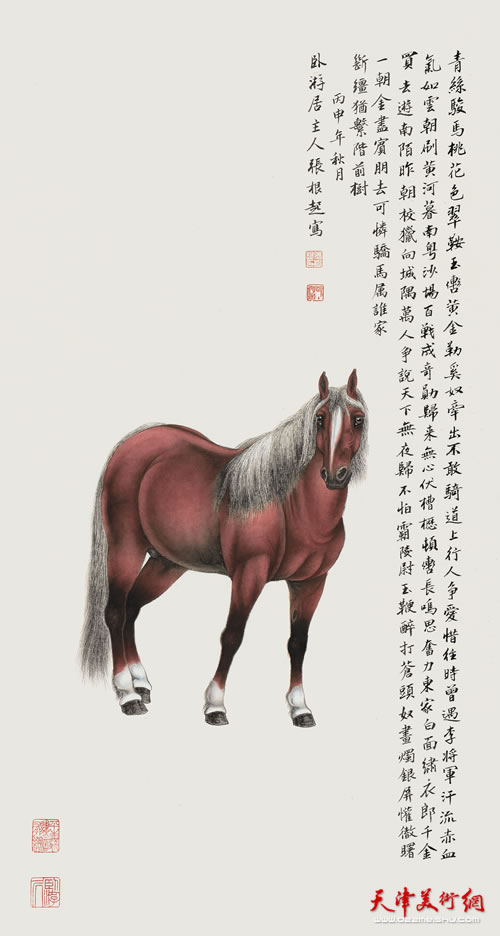 [张根起]:我初学画画的时候就是一张白纸,什么都不懂。溥佐先生问我学什么,喜欢什么,我回答的是您教我什么,我就学什么。当时溥先生决定教我花鸟。他和我说现在的花鸟画是资产阶级,闲情逸致,所以不让画,也没人学了,这以后就没人会了。你需要把这个学会了,早晚有一天,你就会脱颖而出,和别人不一样。溥先生其实就不愿意让这种东西失传,一定要有人继承,所以一定要先教我画花鸟。但是我个人的性格决定,我觉得画花鸟太复杂,太麻烦,它一丁点的颜色,就得换一个碟子,用完一个刷一个,太麻烦了。所以我更喜欢画山水画,就是浓墨和淡墨,再加上一碗水就可以画好半天,坐那不用动。所以后来我就转向了画山水画,在山水画上下功夫。当然画工笔的时候,从开始练勾线,然后一直到染牡丹,染鸟。最后学习染马,平时还要练习写字,相比之下山水画自由发挥的东西更多一点,所以更喜欢画山水,而且越画越放的开。我觉得绘画就是应该面更宽一点。我画来画去,我觉得绘画还是离不开传统,传统的东西不能丢掉,这是我自己的感觉。我画马的时候,我是按照溥先生的马画的,然后顺着我的师爷,就是溥先生的父亲载瀛画。然后再往上,郎世宁的马,我都临摹过。郎世宁的《百马图》我都临过三遍。还有北宋画家李公麟的《五马图》我也临过。我觉得绘画作品是要有传承的,不是自己想变就能变的。所以我不想离开传统,也不想离溥先生这个画派太远。虽然不想离开,但是也需要有改变,就像我画的作品《天马赋》一样。你说不离开,我已经有改变了,但是这种转变是一种很自然的转变,而不是生切硬拉的那种。