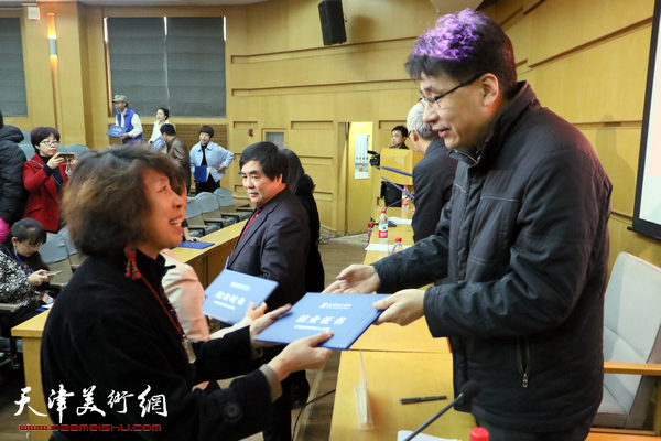 天津美术学院副院长郭振山为学员吕爱茹颁发结业证书。