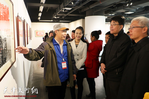 金永伟、郭振山、李志强、主云龙、曹永正等在展览现场观看吕爱茹作品《中国风》。