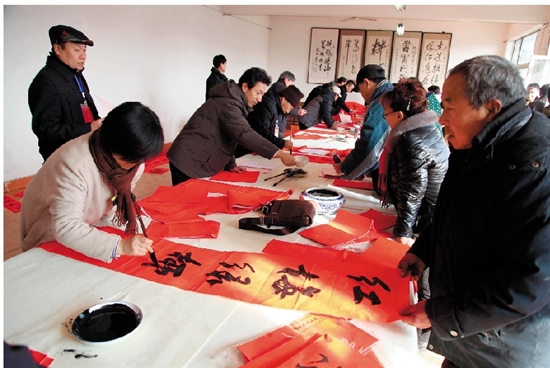 1月23日是农历腊月十四,通州区马驹桥镇六郎庄村室外平均气温达零下十四摄氏度,是入冬以来北京最寒冷的一天。而在六郎庄村大会堂书春活动现场,却洋溢着春意融融的祥和气氛。在举行简短的“义务写春联、万福进万家”仪式之后,首都书画家们在这里脱下外衣,泼墨挥毫,为村民们奋笔书写了一副副充满浓浓年味的大红春联,和一个个喜庆的大“福”字。