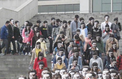 当我看到一整街白花花的脸涌来的时候,不禁想起了一年多前我在威尼斯狂欢节上遭遇的一群群戴着面具的鬼魅身影。据说,威尼斯狂欢节上的面具是为了每个人能够隐去自己的真实身份尽情放纵,因为替代自身面容的是一具无名的脸孔,遮掩了自我的羞涩。威尼斯狂欢节的各种面具由于其不同的工艺制作而各具特征,样式迥异,而杨佴旻设计的面具则有其艺术创意上的鲜明特性:风格素朴,造型极简,虽同样借以面具的媒介,但传递出新异的文化美学意味。威尼斯狂欢节的面具以匿名为其标志,而在杨佴旻的《脸》中,人们所佩戴的每一个面具上都写有诗人的真名实姓,换句话说,通过佩戴诗人的面具,人人都扮演或假托了诗人的角色,借用了某位诗人的另一身份。这个既从属又独立的另一个自我(alter ego)迫使个体认识到自身可能获得的某种诡异的双重性。