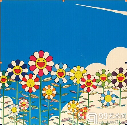村上隆自谓“超扁平风格”,从形态学辨认,是一种混合型的卡通图式,略带妩媚绝无伟岸,但的确表达了电脑取代人脑的时代,虚拟荒涎、自由散漫的青春,支离破碎、花枝招展的玩偶世界。