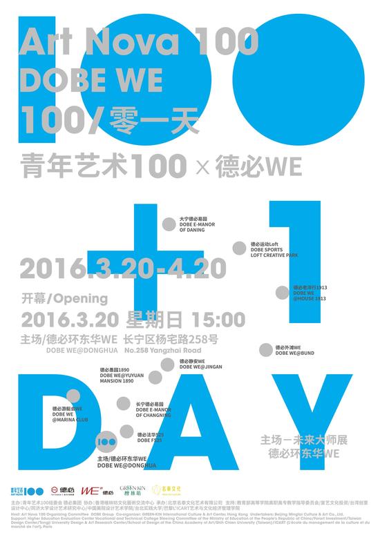 作为“青年艺术100”2016年开年第一个大型落地巡展,“青年艺术100”与德必集团强强联合,集结上海本地企业、文创、媒体、艺术机构等各方力量,强强联合,精彩呈现上海“艺术地图”。由韩宇钟、刘一平、王恬、沈军组建的”青年艺术100“策展团队根据各场地的建筑、设计、历史、人文等因素,特邀历届入选“青年艺术100”的装置、雕塑、影像艺术家以艺术介入园区的展览形式,在德必集团旗下的德必WE国际文化创意中心(环东华)、德必WE国际文化创意中心(游艇会)、德必WE国际文化创意中心(外滩)、德必WE国际文化创意中心(静安)、德必WE国际文化创意中心(愚园1890)、长宁德必易园、德必法华525、大宁德必易园、德必运动LOFT、德必WE国际文化创意中心(老洋行1913)共十个不同风格的文创园区,结合各自园区的地理及文化特征进行量身打造的艺术创作,巧妙的展现了艺术与空间、艺术与建筑、艺术与人文、艺术与历史的对话关系,完美呈现“100零一天”的展览主题。