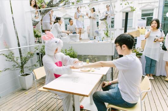 另外一点,兔子本身也是一个复杂的存在,看起来清纯,但它又是playboy情色的代表。兔子不爱发出声音,很静默,但又有狡兔三窟的机灵。我自己在互动过程中我也是不说话的,但要根据眼前的参与者来迅速反应,所以刚好也是一个同样的境遇。同时,兔子不会像老虎、豹子、蛇之类让人产生恐惧或者不舒服感觉,大家也不会觉得一定要像对待狗或者猫那样,我要逗逗你或者怎么样。这样一个形象是不会让人产生抗拒的,它只是在那里,可以有一定的距离,然后有它的独立性。大家就觉得那是一只兔子,一个存在而已。