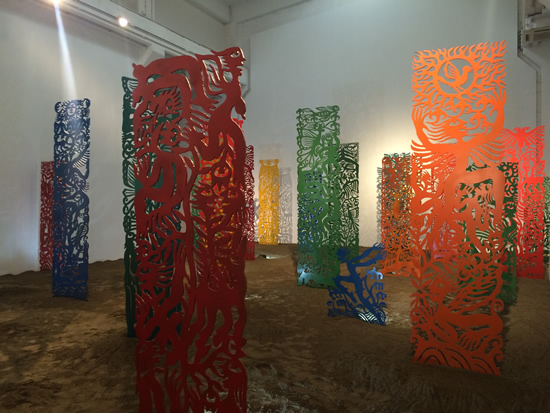 再细读每一件作品,在镂空的形象中,可以阅读到所有的人类文明史,从亚述文化、玛雅文明到埃及文化; 从印度文化,日耳曼文化到中国“山海经”; 从古篆书体到现实中各国的货币符号、乃至各个宗教中的玄秘符号都包含其中;各种人物、花枝、鸟兽、未知生物之间的位置经营,都有着深思熟虑的互动链接,疏密得当,间架合理,又如同中国书法的提笔运字,任戎的作品将中国传统书画中的要诀与西方雕塑立体造型之间建立了某种契合关系。在展览现场的沙场里,暗隐的射灯,射向矗立的作品和行走的人群,投影在空间墙面,动静结合,光影流转,如同进入一座神秘伊甸园。