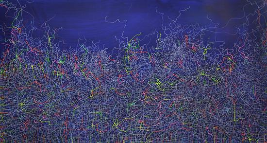 阮詩寇博士(Dr。 Rasko Radovic) 发言中指出艺术家仿佛无尽的曲折的线条以及大跨度的弧线,构成了纠缠的迷宫,让人不禁要寻找出路和通道。这过程正如我们意图身居其中的而向往别处的城市,纵横交错的无尽街道被抽象地表达出来。这些线条挥洒延伸,也呈现出艺术家娴熟的技法和沉稳掌控,犹如书法的风骨。线条起伏,伸向不同的方向,承载各异的意义。这次展览所呈现的系列,让人联想到音乐主旋律的变幻重复但绝不雷同。艺术家大跨度弧线的作品更像是“禅修”,线条不容顿挫,一气呵成,仿佛在考验艺术家的意志和定力,艺术家以手工者的专注完成每一个弧线,与交错回转的迷宫式构图形成延伸和对比。