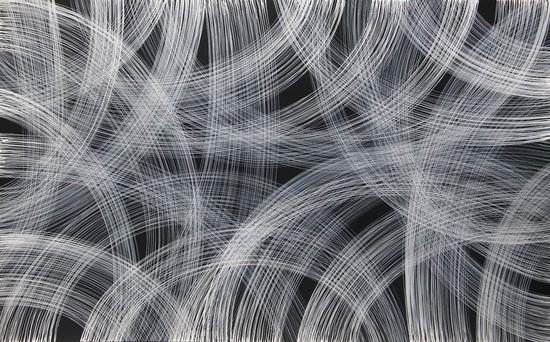 张庭群的作品,让人联想到古希腊国王米诺斯的女儿阿里阿德涅交给情人忒修斯的线团,线团帮助他走出了迷宫。艺术家经年累月地在画布前编织的迷宫,极其巧妙地将经纬隐藏其中,这走出迷宫的线团就在你我眼里、心中。