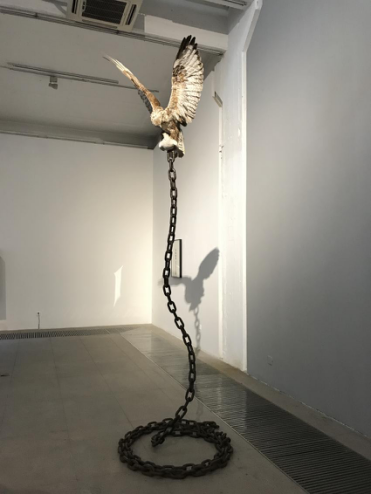 艺术家张琪凯介绍自己艺术创作时表示,此次展览的作品整体上是有联系的,但又分为三个部分,《360度》、《皮毛而已》、《我爱你》这三件作品是一个整体,其中《360度》是此次展览最重要的一件作品,众多电视围成一个圈,上面播放着不同国家的新闻,它们相互之间可以是独立的,也可以是联系的,很像是在对话,但同时又像是一个嘈杂的世界,各种语言争夺话语权,中间是一个金字塔,是一种权利和金钱的象征;《皮毛而已》牛皮用五花大绑的方式被固定在墙上面,艺术家个人认为这是一个新的很刺激的状态;《我爱你》说是我爱你,其实是鹰在强奸和平鸽,也就是强权在强奸和平,这件作品在视觉上会显得比较活泼,因为作品讨论的话题比较沉重,所以需要视觉上来平衡。