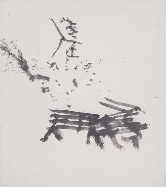 了了的新作画的是石头,画面沉重,有天崩地裂之感。这是因为前一些日子了了去了四川而亲身经历了地震,于是又去汶川地震旧址,所见所闻萦绕于脑际,落下为笔墨,是大自然不可抗拒之力量的震撼,经过笔、墨、宣纸的冲撞而产生的作品。我去年在展览里看到过他的画,是长幅荷花,给观众留下飘然潇洒的印象。这次同样是用黑墨、白颜料、宣纸画作,却呈现完全不同的效果;石头以机理呈现,而不是传统的图像呈现,行动的速度与激情展露无余,如此单薄的宣纸表达如此沉重的石头,让人在惊愕之余了解到笔墨宣纸的新一层潜力。