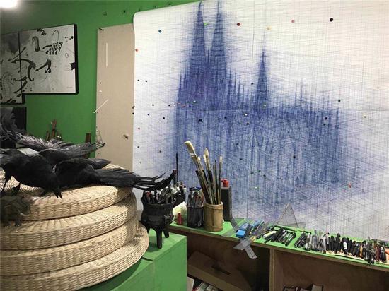 借《三体》中,章北海在太空电梯里射杀了身着宇航服的专家这一幕,当你乘坐电梯到达位于三楼的“参艺术空间”,所目击的一个作品《恐龙打飞机》,将会带你进入一个人类大规模进入太空的前奏,这是对整场展览的序。