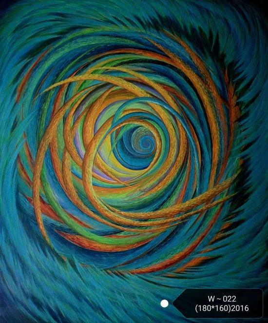 王冰的抽象画,刀笔回环融会,色彩在层层重叠中晕染生辉,色彩的自由表现拓展了全新的维度。颤栗的色点被刀锋砥砺出闪烁的斑斓,画笔纵横穿越,画面绽放出鲜活的自然肌理。圆弧系列作品中色彩交孕混生,韵律的回响中渲染着微妙的情愫;星云系列作品大象无形,隐潜的符号己熔化涅槃:火之奇幻、云蒸霞蔚之壮美、海渊之幽邃,跃然画上。