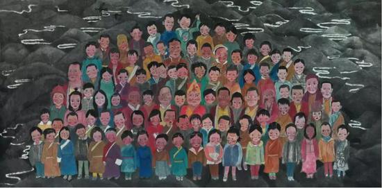 《太阳野花》,创作于 2016 年,为宣纸国画,作品源于一次进藏援教,我在位于甘孜藏族自治州的白玉县纳塔乡教授美术,每天下课的时候,孩子们会在操场上做游戏,我给每个孩子写生,他们都很惊讶和认真的站在我的对面,这样,我画下了全村的孩子,然后给他们画了一张大合影,取名“太阳野花”。