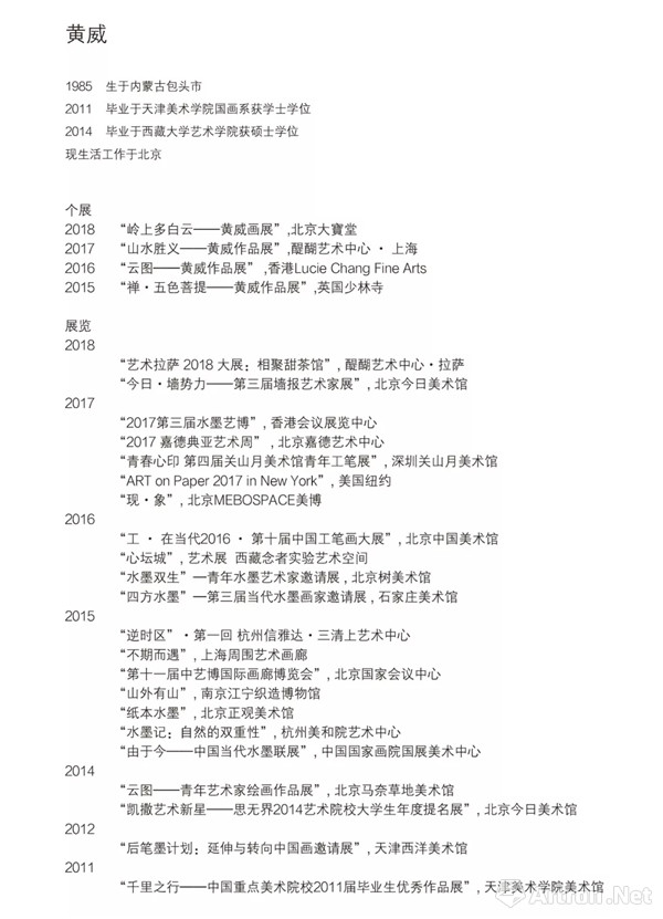 黄威是个快乐的人。一米八的内蒙大汉,见人总是浅笑吟吟。如果有点什么烦心的事情,可能过一会儿也就好了。这或许和他在西藏三年的求学有关系——每天看着拉萨河,对面的山间和云朵,谁还会闷闷不乐呢?他的导师,杰出的当代水墨艺术家李津评说,哪怕黄威画一只杯子,都有信仰的元神进驻了。他笔下的那些点:“一看味道就很正,就像和尚敲木鱼那样,当当当当,均匀而开阔。”有位第一次见到他的医生朋友说,这位艺术家,眉间好像有尊菩萨。那是去年,黄威在醍醐上海中心举办个展“山水胜义”,他的女儿小云朵刚刚出生。