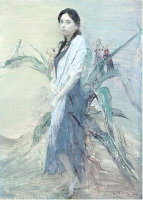 沈从文说过:“美丽总是愁人的。”基本上这已经道出了诗性的本质。也许,诗,就是思绪对于时光流逝的一种挽留吧。之所以容易悲从中来,就是因为时光已逝,只留下人在岸边。何多苓的绘画就是站立于岸边的一声叹息。尽管他笔下的人物多是些娇媚的女性,但却丝毫没有“小桥流水人家”般的温情,而是透着“古道西风瘦马”一样的苍凉,给人一种“独吹边曲向残阳”的落寞之感。这,就是何多苓的悲剧之源,也是他艺术作品的升华之所在。