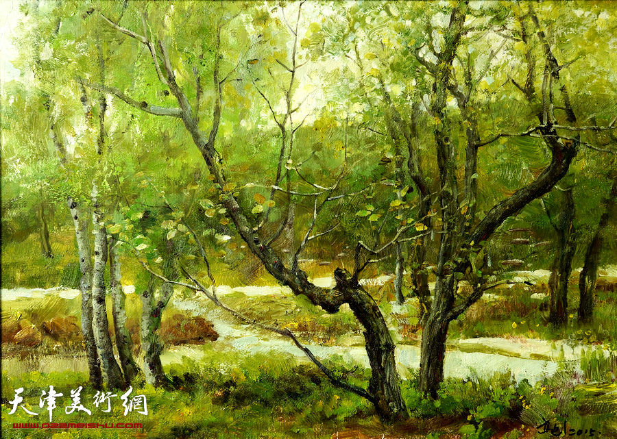 高建章每年都坚持外出写生,他的风景画系列,同样是以大自然为素材,以切身感受画景抒情。《太行魂》是他的获奖作品,这幅油画没有具体描绘太行山的何处何景,而是着重创造了一种气势和意境,勾勒了一幅苍茫大气、雄浑厚重又灵动感人的万千景象。图中远处高山耸立,状若卧虎,气势磅礴,由远及近黑白相映,水石相融,飞瀑流淌,使画面统一在了宏伟深邃的意境之中。仿佛是让我们站在空蒙的大山脚下,看那落日余晖折射在大山上的金碧辉煌,听那山脚下浪花飞溅的哗哗河水声。这些气象直接得之于大自然,却又不是大自然的简单摹拟,而是经过了升华的艺术家的心灵创造。