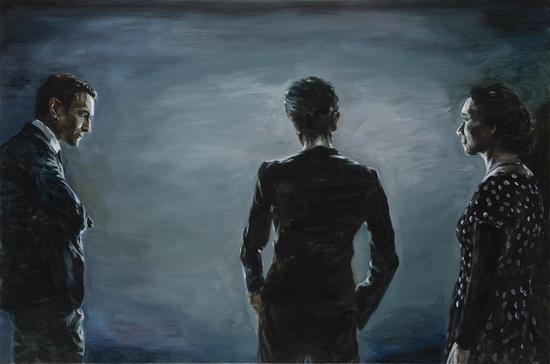 陈晗,1973年出生于辽宁,2005年毕业于以写实主义传统著称的鲁迅美术学院油画系。在过去的十年里,陈晗从男女人物演绎都极具戏剧张力的黑色电影中汲取灵感,形成了自己现在独有的绘画风格。人物总是以窃窃私语和密谋者的形象出现在镜框里,观众则成了窥视者。这些形象始终避开了与观众的直面交流,他们共同密谋,他们相拥哭泣,他们始终背对着我们。