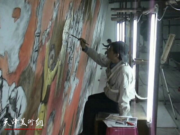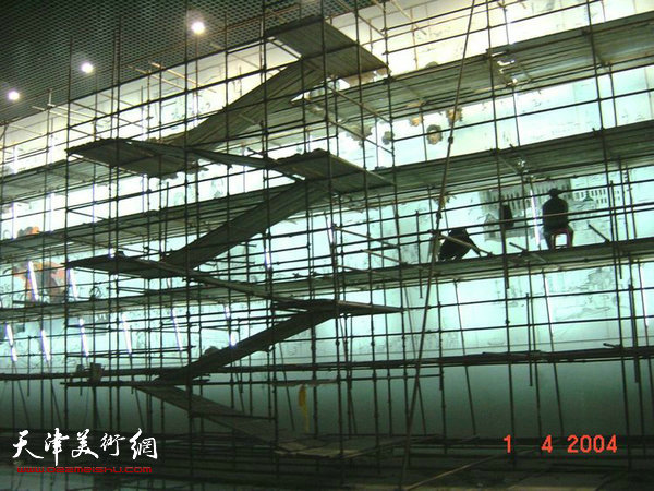 王书朋和妻子何莉的创作图一次就通过了审查,接下来需要做的是在天津博物馆3楼一面近200平方米的墙上绘制这幅画。2004年2月,天津博物馆内部还在装修,王书朋和他的团队就在那面墙跟前搭起了8米高的6层脚手架,并在架子上安装了几十个灯管,之后开始创作。