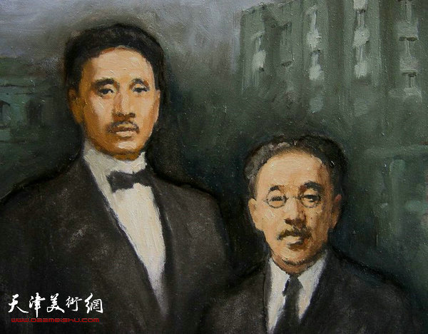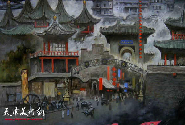 王书朋接到邀请创作这幅油画是在2003年,当时他拿到了一个文字脚本,要求在油画中展示天津近百年来不同历史时期的人物和特点,此外还要表现出天津的城市特质。为了还原历史,王书朋和何莉查阅了大量资料并且听取相关专家的建议,确定了画面中出现的人物和场景。“为了表现天津作为河海城市的特质,我在构图时让海水漫过了地平线,画面当中红色的背景上画了和抗日战争、解放战争等有关的内容;左边以老城厢的建筑为背景,事件上则表现大沽口抗击八国联军入侵、义和团运动等;右边以租界建筑为背景,人物以近代各界社会精英为主,表现外来文化对天津的影响。”王书朋介绍说。
