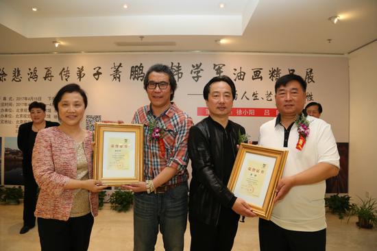 中央美术学院(微博)资深教授戴泽先生、原中国美术家协会版画艺术委员会副主任杨先让老先生、北京油画学会副主席石成峰先生、原中宣部新闻局副局长张文祥女士、本次展览的策展人国家京剧院京剧名家吕昕女士、本次展览的策展人徐悲鸿的长孙徐小阳先生、本次展览的策展人北京视觉经典美术馆运营总监王学泉先生、中国原创艺术研究发展中心主任刘有晔先生、北京画院创作室主任纪清远先生、首都师范大学美术学院中国画系主任汪港清先生、首都师范大学美术学院教授博士生导师韦红燕女、北京红旗业大艺术系系主任刘溯先生、著名动物画家萧万庆先生、著名山水画家樊林女士、中国长城书画院副院长彭世强先生、中国长城书画家协会秘书长任鑫先生、人民艺术家月刊总编汪明华先生、蒋兆和之子画家肖和先生、文化艺术术推广人黄珂先生、派顿(中国)公司董事长郭廷真先生、艺术经纪人张鸿宾先生、鉴赏家滕华明先生、北京视觉经典美术馆馆长吴华女士等近百名嘉宾受邀并出席了此次展览的开幕式仪式。下午四点还举办了“徐悲鸿再传弟子萧鹏、韩学军油画精品展”艺术研讨会。