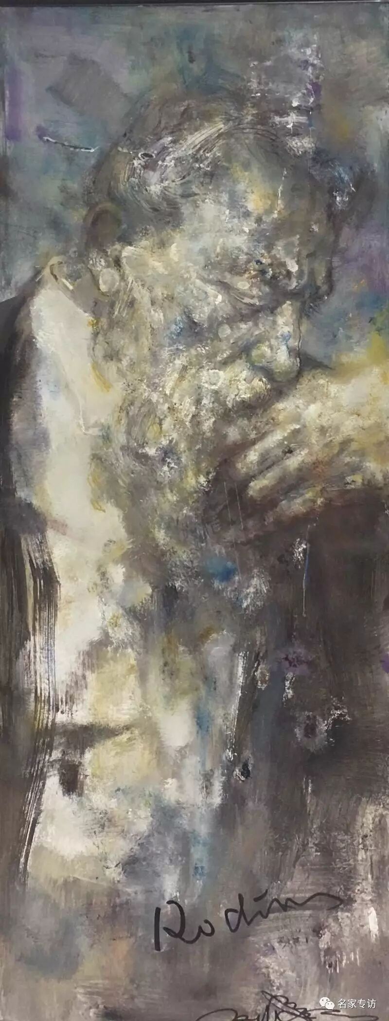 从邢健健人物创作的轨迹来看,有几个节点是值得关注的。邢健健最初的人物创作带有抒情、唯美的倾向,把人物置于一种宁静的环境之中,并对人物的姿态格外的留意,通过对一些优美姿态的定格来表现出审美的趣味。接着,他的人物的环境变得抽象起来,表现性和图绘性特征日益显著,图式感也不断增强,在色彩运用上也带有更多的主观性。以往平静的画面为一种焦虑所替代。这种现象,从本体语言上来看,是一种探索的痕迹,从心理上来看,更像是画家的情绪的宣泄。现在,邢健健所创作的各种历史人物可以说又恢复了一种平静,它们走进了历史的深处,作品变得深刻而沉重。毫无疑问,邢健健的这些作品来源于照片,却又回归成“照片”,但它们绝不是简单的模仿或还原,它们刻录下了画家对历史的新认识和再理解,在消失的面容中复活了历史的面貌。邢健健似乎在画家系列中倾注了更多的心血,发挥了更大的自由,无论是齐白石,还是梵高,他认为在他们的肖像中可以加注更多的主观理解和塑造,因为面对这些艺术家们,他自信要比别人认识得更加深刻。