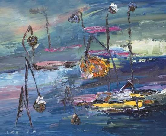 “荷塘人文”为其一。荷为自然生,荷塘却离不开人文自觉和人文关怀,荷花意象的艺术创作涵盖了对荷花的自然万象的描绘、比较、选择和对荷花的人文思索的分析、概括、提炼。《荷花少女》是三连屏布上油画作品,十里荷叶满塘绿,少女如花入夏秋。《紫荷之梦》《莫荷之吟》《荷塘藏春》《荷香销晚夏》《多加荷塘三分秋》和《雪里已知春信至》等布上油画作品切入了荷花的人文视角,还尝试融入东方神韵、表达对莫奈之荷的敬意,在油画语言上积极探索艺术个性。
