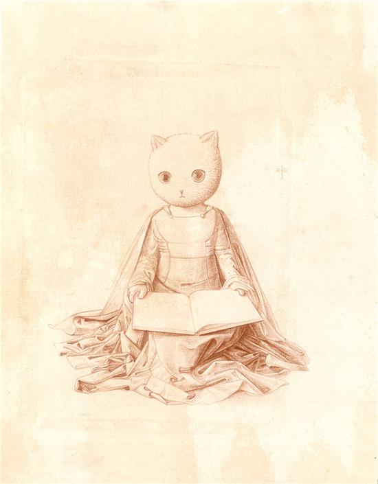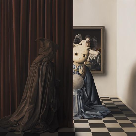 纵观张凯十年的创作历程,我们看到他在这其中的坚持:其一,是形象可爱的拟人化主角——猫与兔;其二,是对艺术史上经典作品的挪用。这两点坚持,在他的作品中构成了一个静谧、神秘的情境,给人留下深刻印象。这种坚持源自于他自身艺术体系的建立,即对艺术史的梳理、分析和对当代艺术的深刻认知。在对艺术史的回溯中,最初由单纯的审美偏好入手,从后印象派到文艺复兴,一路追溯至中世纪艺术,在表现方式上夯实了根基。而后,他向内回归至自我表达的精神诉求,通过拟人化猫、兔形象的塑造,将自我投射到画中的古典世界,最终产生与古典大师的精神共鸣。