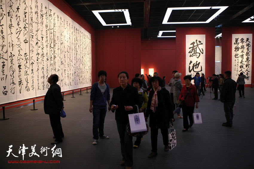 天容海色—马孟杰诗文书法展在山东美术馆开幕,图为观展嘉宾络绎不绝。