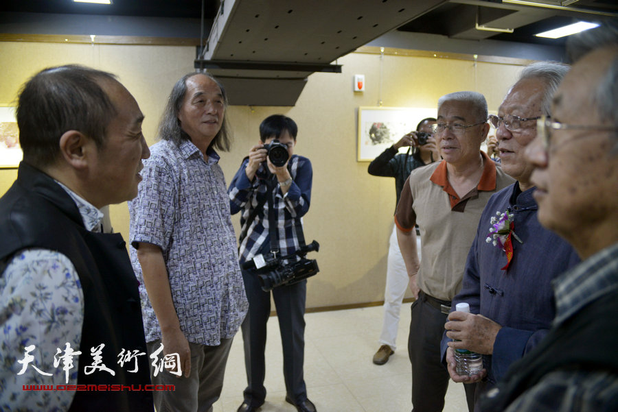 山草情·高卉民大写意花鸟画展亮相天津人美出版社美术馆,图为高卉民、卢禹舜、贾宝珉、苏鸿升等在现场交流。