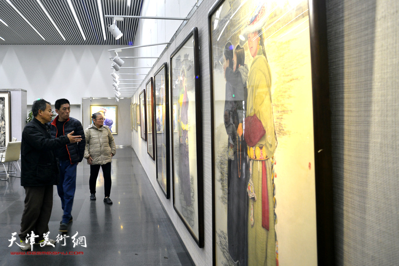 乔晋津、赵新立、于晓鸥等在画展现场观看作品。