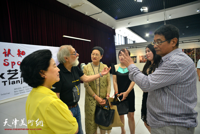 曹秀荣、Gerald Hushlak、郑少英、张含光、李澜在展览现场交谈。