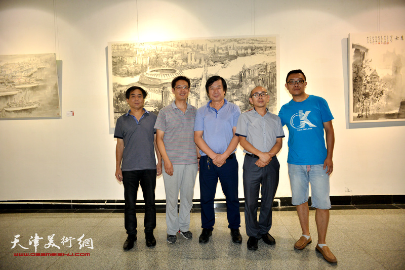 左起:魏瑞江、博君、张玉忠、宋世凯、田军在画展现场。