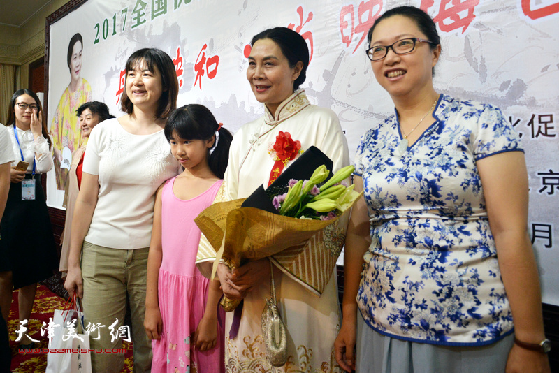 肖映梅与“天津亲友团”孙萍茹、袁梦妮在画展现场。