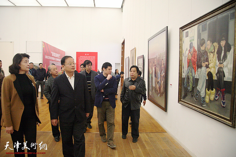 天津市委宣传部副部长石刚,中国文联理论研究室副主任徐粤春,天津市文联党组书记、常务副主席万镜明,全国政协委员、天津市文联副主席、天津市美术家协会主席王书平,天津市美术家协会副主席孟庆占,天津市美术家协会秘书长李耀春,中国书画报社社长何东,天津市美术家协会展览部主任张福有,著名画家皮志刚在画展现场观看作品。
