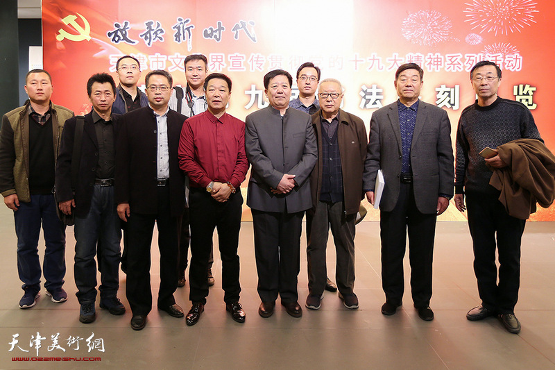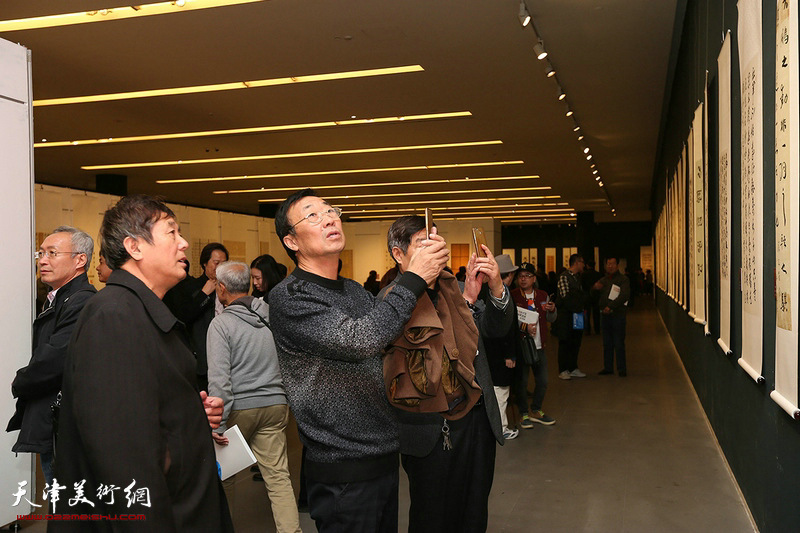 当代北碑巨匠、著名书法家孙伯翔先生,天津市文联党组书记、常务副主席万镜明,中国书协副主席、天津市文联副主席、天津市书法家协会常务副主席张建会,天津市文联党组成员、天津市文联秘书长商移山,天津市书法家协会原主席唐云来,南开大学教授刘运峰,天津市书协驻会干部薛卫林在展览现场。