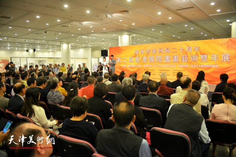 天津美术网讯 为庆祝香港回归20周年,由国际书画名社总会,中国书画报社,中国画学会,中国书画收藏家协会联合主办;柱石美术馆,东莞诗书画研究院,芭而蒂服饰,深圳董希源慈善基金会,《中国书画报》东盟艺术中心、济南艺术中心、长沙艺术中心、天水艺术中心、华夏珍宝艺术中心、南京艺术中心等单位协办的“第二届香港国际书画艺术双年展”于11月18日在香港中央图书馆隆重开幕。