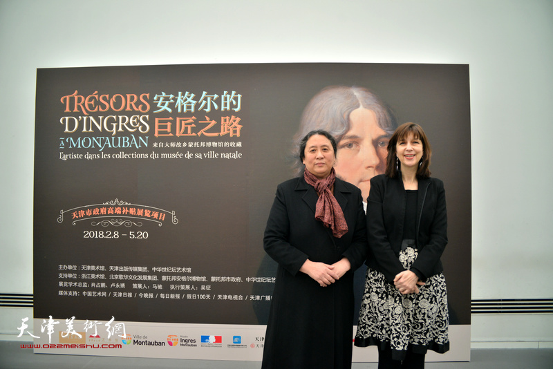 蒙托邦安格尔博物馆遗产管理负责人兼馆长佛罗朗斯·维吉耶—杜泰伊与天津美术学院油画系教授郑岱在展览海报前。