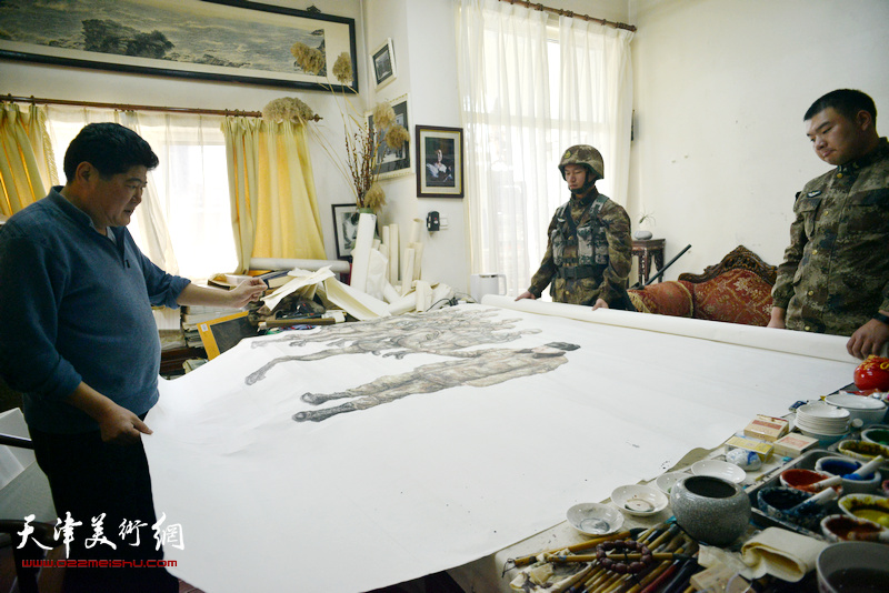 画家王悲秋节日加班加点画画忙 巨幅画作《主席与战士》主体告成