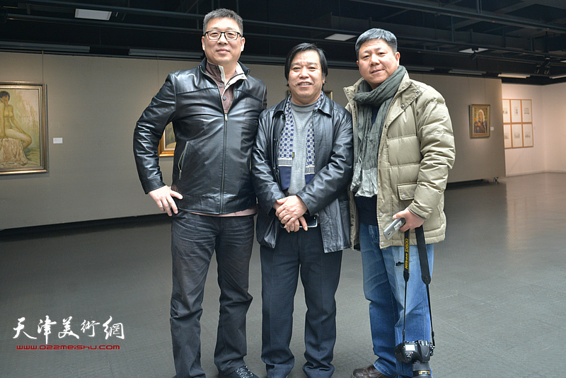 边静与霍春阳、周世麟、潘积成在画展现场。