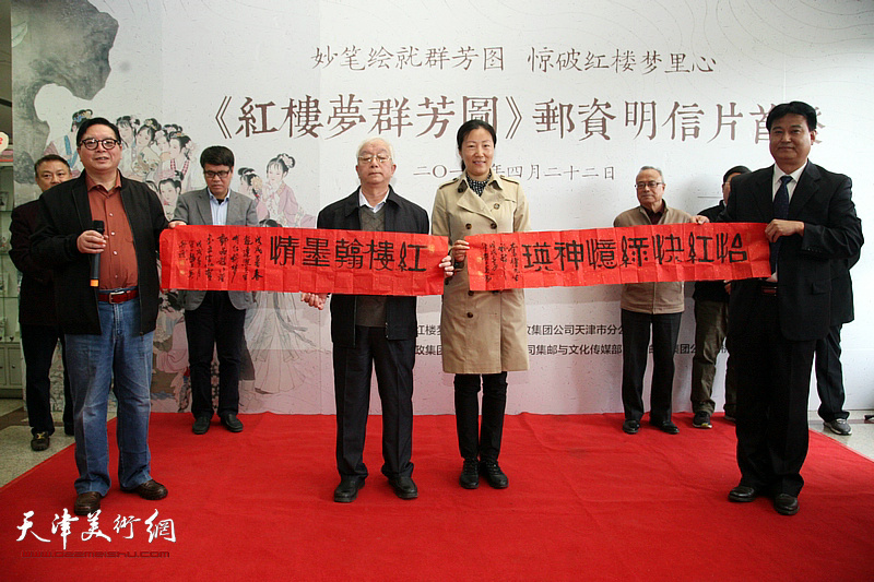 出席首发式的领导和嘉宾为《红楼梦群芳图》邮资明信片揭幕。