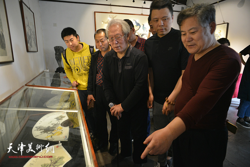 贾宝珉、郭书仁、翟洪涛、杨俊玲、田军与来宾在画展现场。