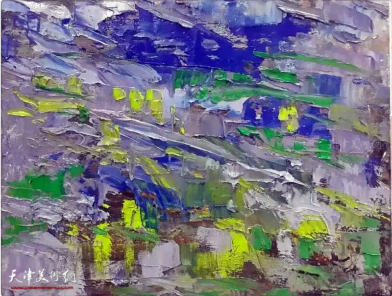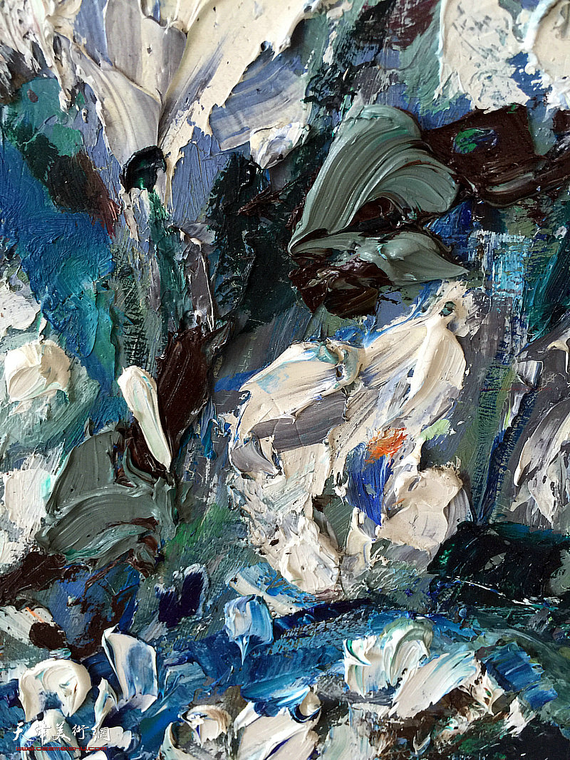 我曽与焦小红讨论过她的创作过程。她说:她的大部分创作都是凭记忆在默写中完成的,即便是写生,也是看几眼,就闷着头画,直到画完。她的《印象冰岛》就是在完全默写的状态下完成的。当我看到这幅画时完全被震撼了。灵动的色彩,奔放的笔触,水流与山石的质感被她表现的淋漓尽致。