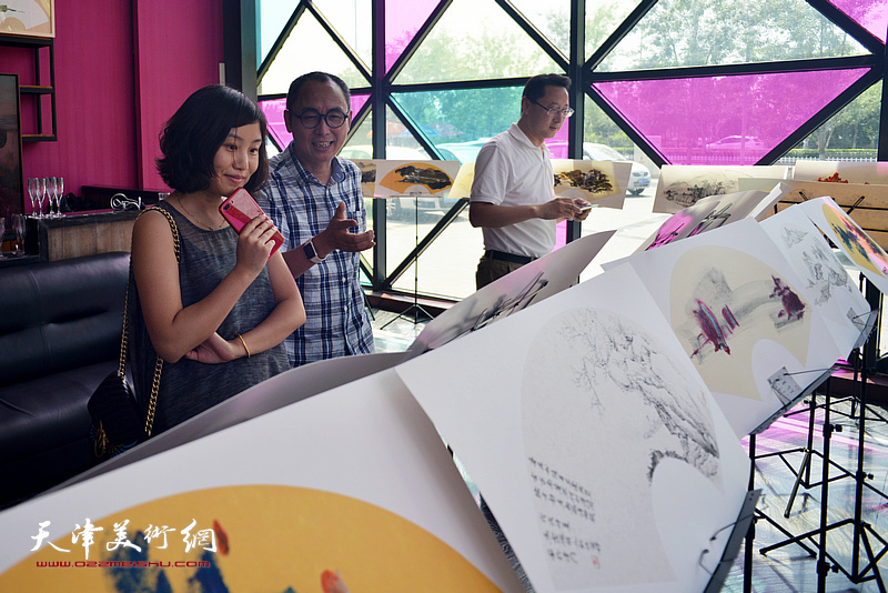 马霑与来宾在画展现场观赏展品。