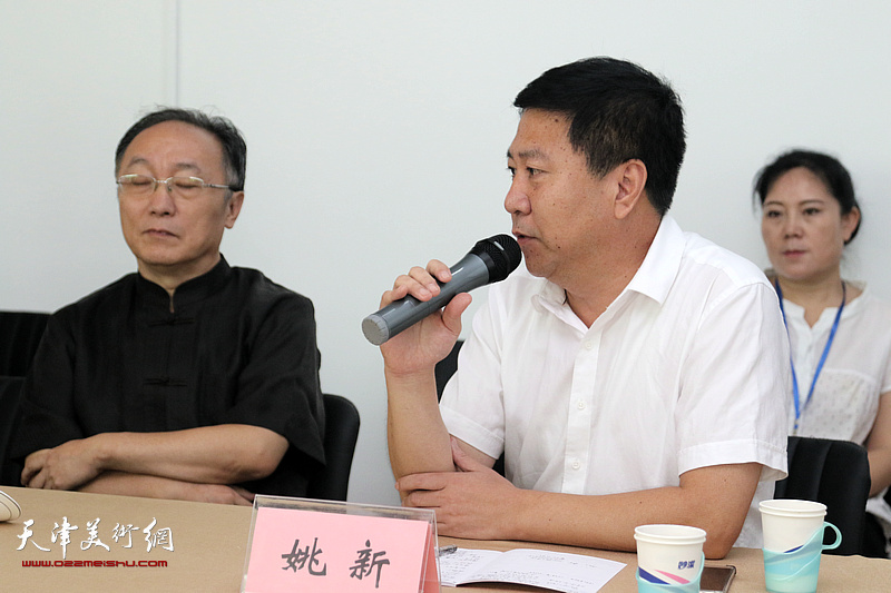 静海区民族宗教事务和文化广播电视局党组书记、局长姚新介绍画展情况。