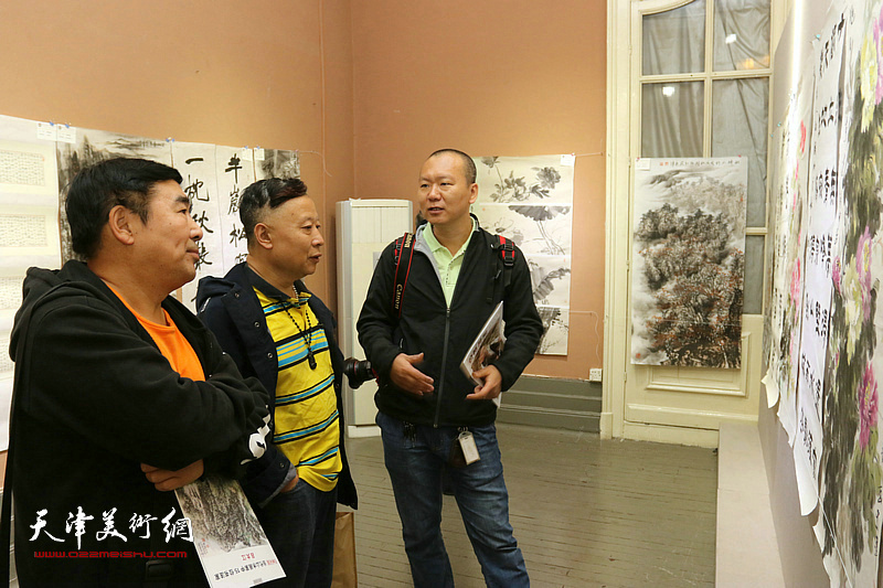 刘红、方大开、安士胜、孟庆海在展览现场观看作品。