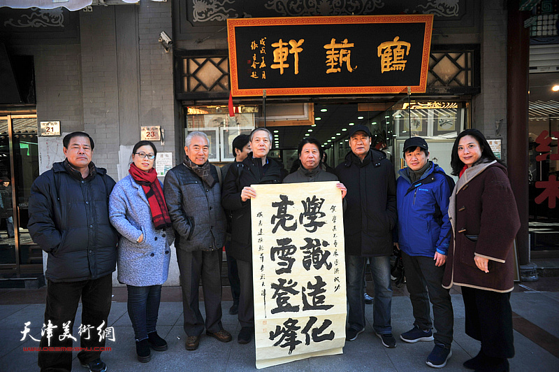 书法家臧志建为祝贺画展送来贺词:学识造化,亮雪登峰。左起:张树滨、张贵红、杨来春、臧志建、李学亮、马寒松、范传江、兰玲在鹤艺轩。