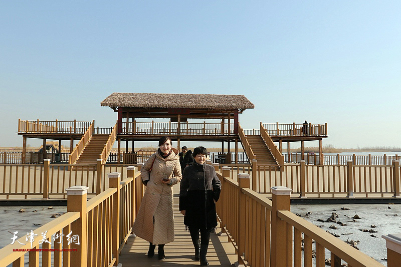 爱新觉罗·梦玉、李悦走在白洋淀湿地公园的长廊栈道上。