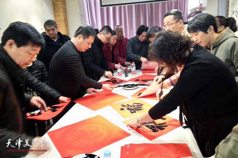 当天上午,由天津市书法家协会驻会副主席邵佩英带队,副主席刘洪洋、郝军,理事门玉华、李宁、张晓强、张海莹、曹善华,中国书协会员季家松、朱彦民、史东,天津市书协会员刘克峰、刘建成、李福来、张法东、张继承等“新时代红色文艺轻骑兵”书法家小分队来到群众中间,挥毫泼墨,把一幅幅“福”字和春联,送给现场村民。一上午,共书写福字和春联三百多件。同时还指导当地书画爱好者创作作品,受到当地村镇居民群众的热烈欢迎。著名画家董铁山应邀参加了本次活动。